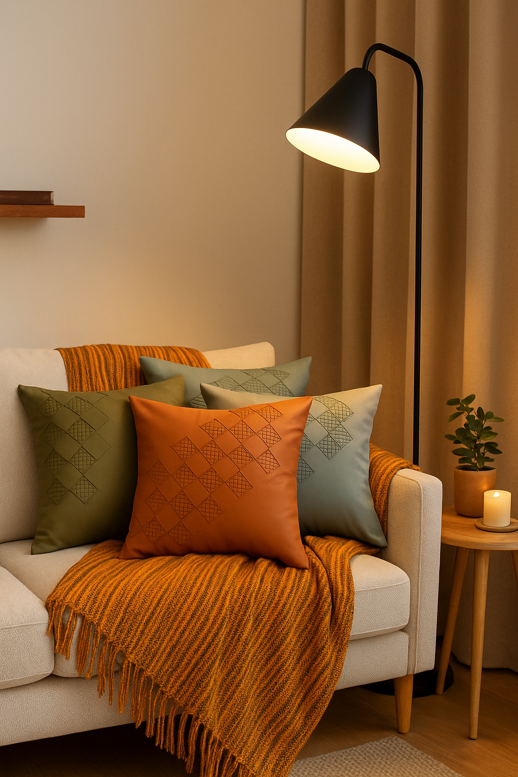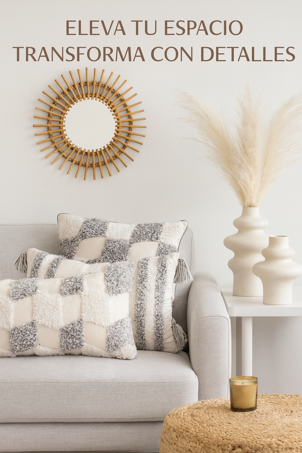 Nuestros cojines artesanales, con texturas suaves y tonos cálidos, aportan el toque perfecto de elegancia y confort que tu sala merece.